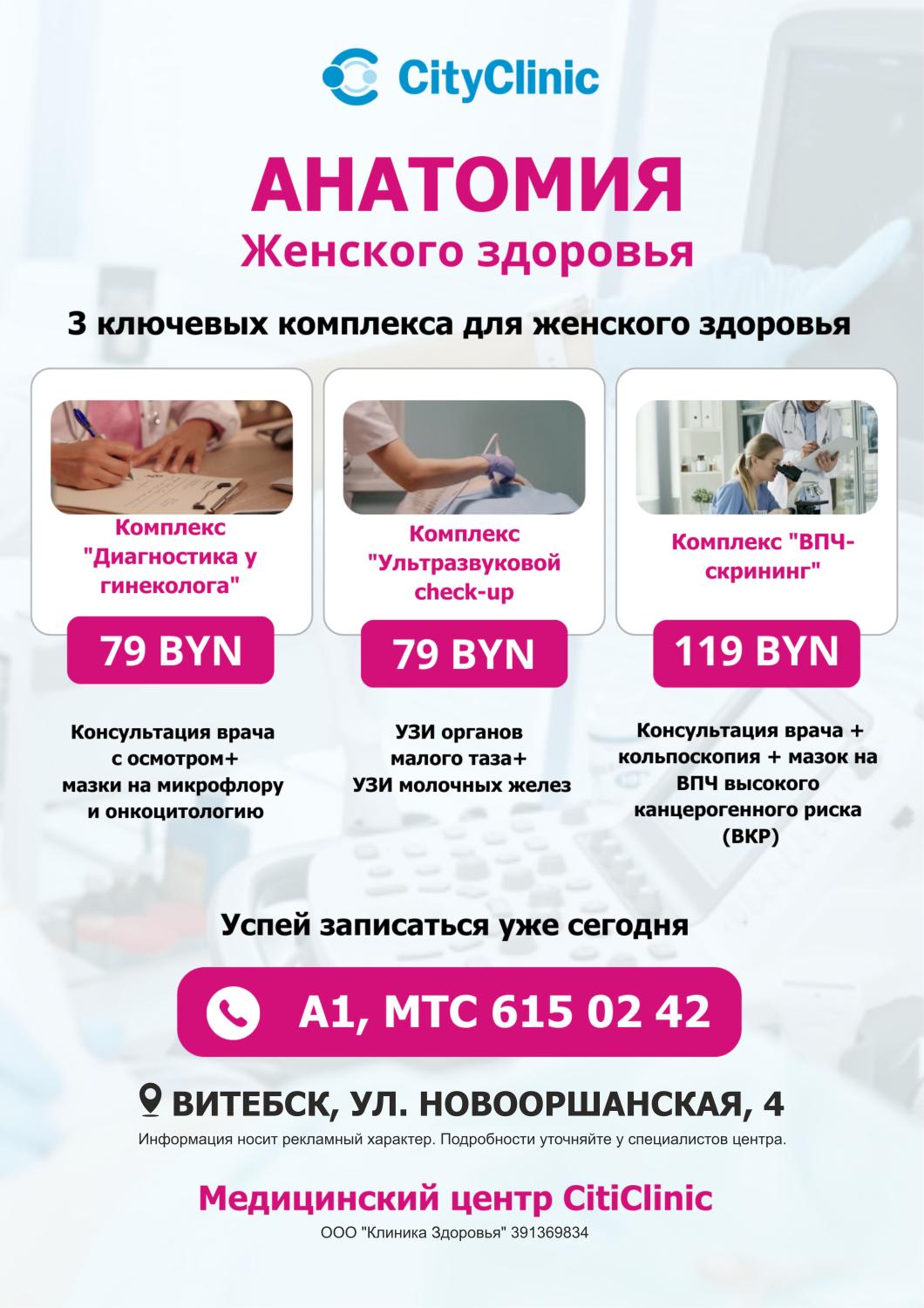 Консультация врача + кольпоскопия + мазок на ВПЧ высокого канцерогенного риска (ВКР) - 119 BYN